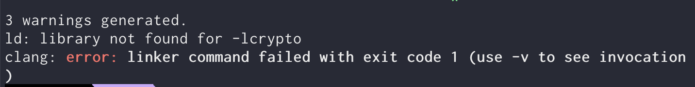 3 warnings generated. ld: warning: ignoring file /usr/local/opt/openssl/lib//libcrypto.dylib,